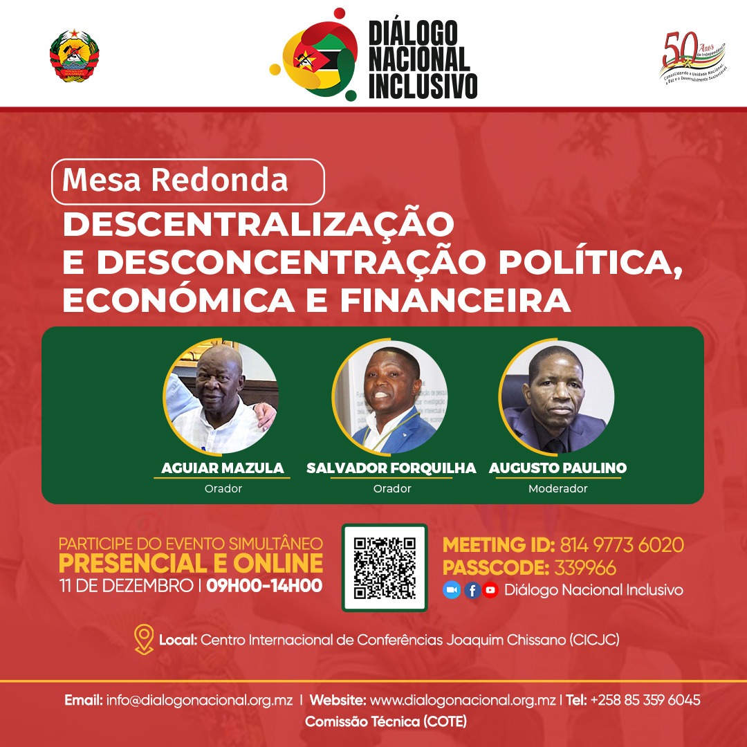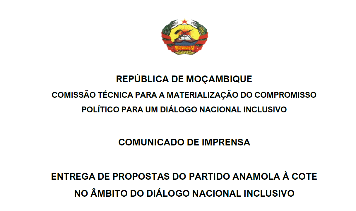 No quadro da implementação do Diálogo Nacional Inclusivo, a Comissão Técnica (COTE), criada pela Lei n.º 1/2025, de 11 de Abril, convida todos os órgãos de comunicação social a realizar a cobertura jornalística do evento que contará com a presença dos Partidos Políticos Extraparlamentares, no âmbito da auscultação pública realizada pela COTE. Este evento terá lugar no dia 13 de Novembro de 2025, pelas 8h30min, no Centro Internacional de Conferência Joaquim Chissano, em Maputo (na Av. da Marginal, N.4441).