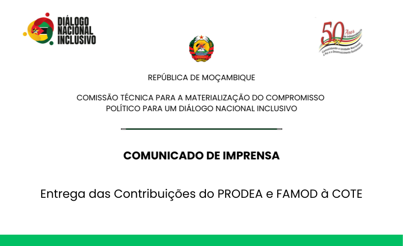 A Comissão para Observação e Participação Juvenil no Diálogo Nacional Inclusivo (COPJ-DNAI) submeteu, nesta sexta-feira, 13 de Março de 2026, um conjunto de propostas à Comissão Técnica para a Implementação do Diálogo Nacional Inclusivo (COTE), durante um encontro realizado no Centro Internacional de Conferências Joaquim Chissano, em Maputo.