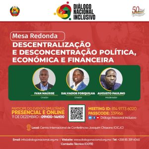 No âmbito dos debates promovidos pela ComissãoTécnica (COTE) do Diálogo Nacional Inclusivo, terá lugar, no dia 11 de Dezembro de 2025, às 09:00 horas, em Maputo, uma Mesa-Redonda subordinada ao